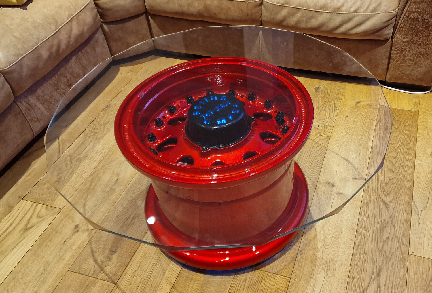 This remarkable furniture item has been expertly constructed using an exceedingly rare Boeing 747-200 aircraft main wheel. It boasts a stunning candy apple red finish with contrasting jet black bolts, and a backlit 3D center hub that symbolically connects it to MK Airlines Boeing 747-2R7F G-MKGA. Topping it off is a 10mm diamond-cut, brilliantly sculpted glass surface.